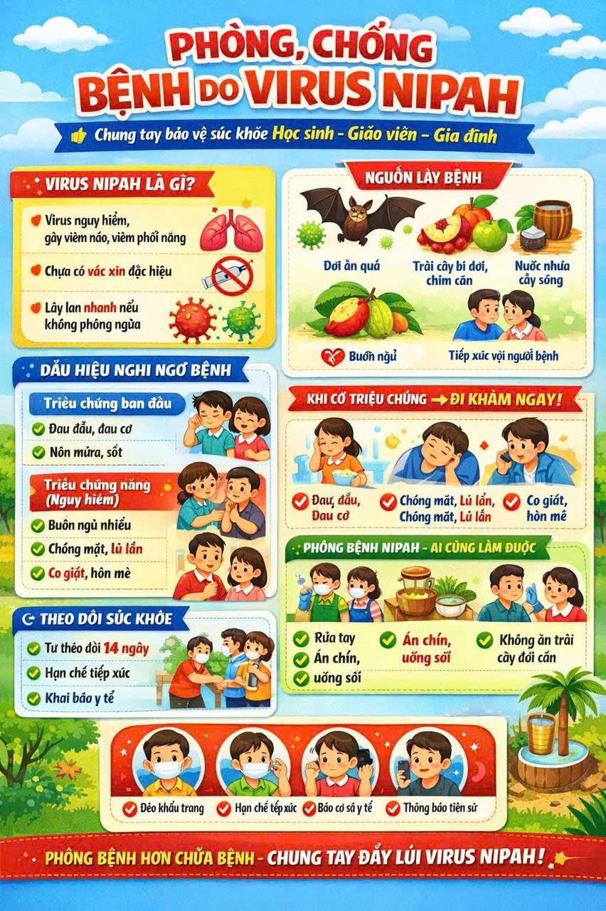 Nhằm chủ động phòng, chống dịch bệnh truyền nhiễm nguy hiểm do **virus Nipah**, nhà trường đề nghị **cán bộ, giáo viên, nhân viên, học sinh và cha mẹ học sinh** nghiêm túc thực hiện các biện pháp sau: Thường xuyên rửa tay bằng xà phòng, giữ gìn vệ sinh cá nhân và môi trường sống sạch sẽ.