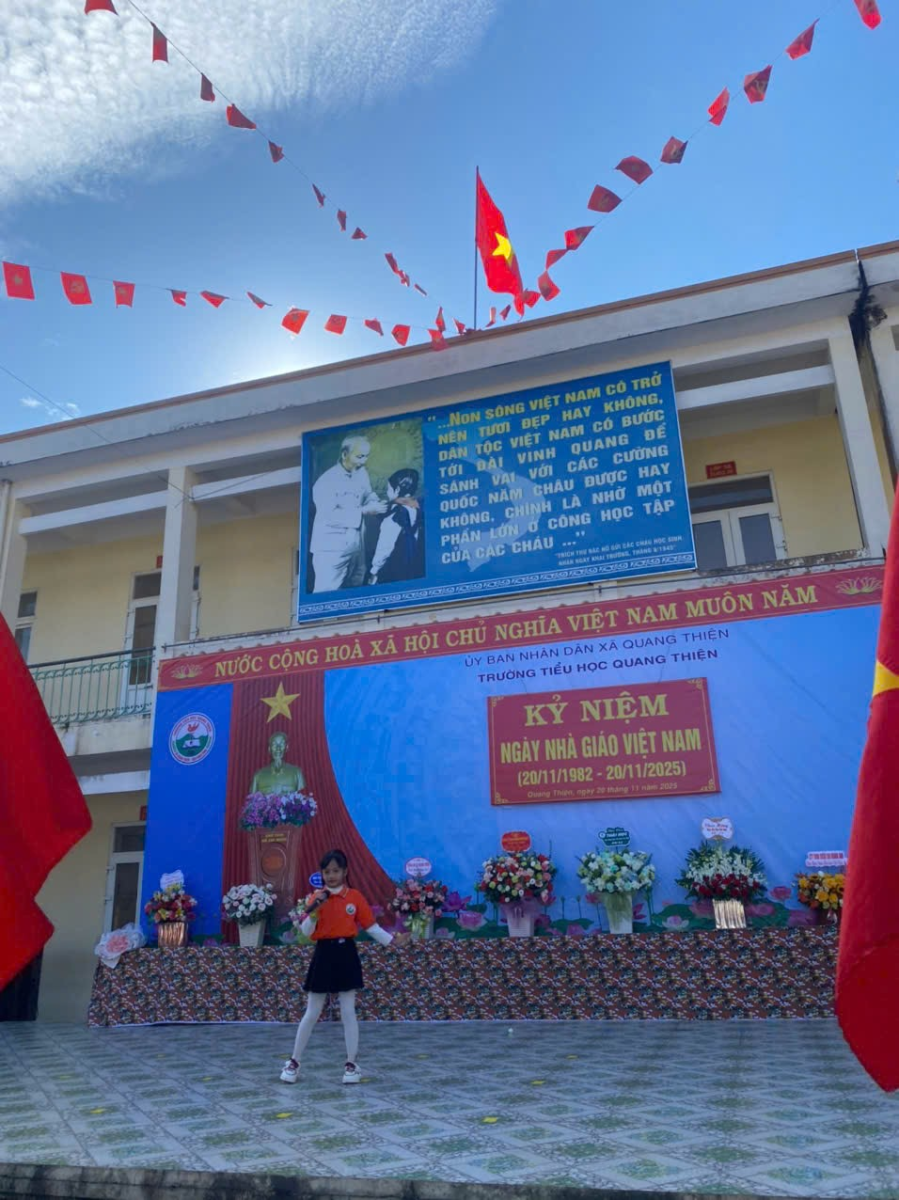 Sáng ngày 20/11/2025, tại sân trường rực rỡ cờ hoa, Trường Tiểu học Quang Thiện long trọng tổ chức Lễ kỷ niệm 43 năm Ngày Nhà giáo Việt Nam – một sự kiện ý nghĩa nhằm tôn vinh truyền thống “Tôn sư trọng đạo” và tri ân đội ngũ thầy cô giáo đã và đang cống hiến cho sự nghiệp trồng người.
